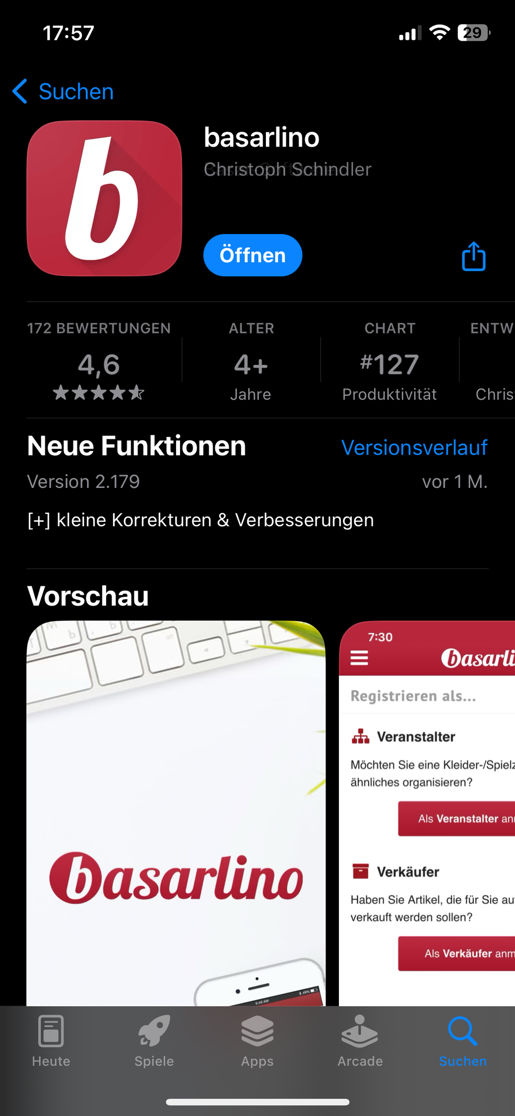 Du findest die App mit dem Suchbegriff Basarlino. Der Download und die App sind absolut kostenfrei. Erst wenn Du wirklich zum Verkäufer wirst und deine Artikel bei uns vorbeibringst, musst Du den einen Euro Gebühr mitbringen. Diese Gebühr wird von uns auch zu 100% an Basarlino weitergegeben.