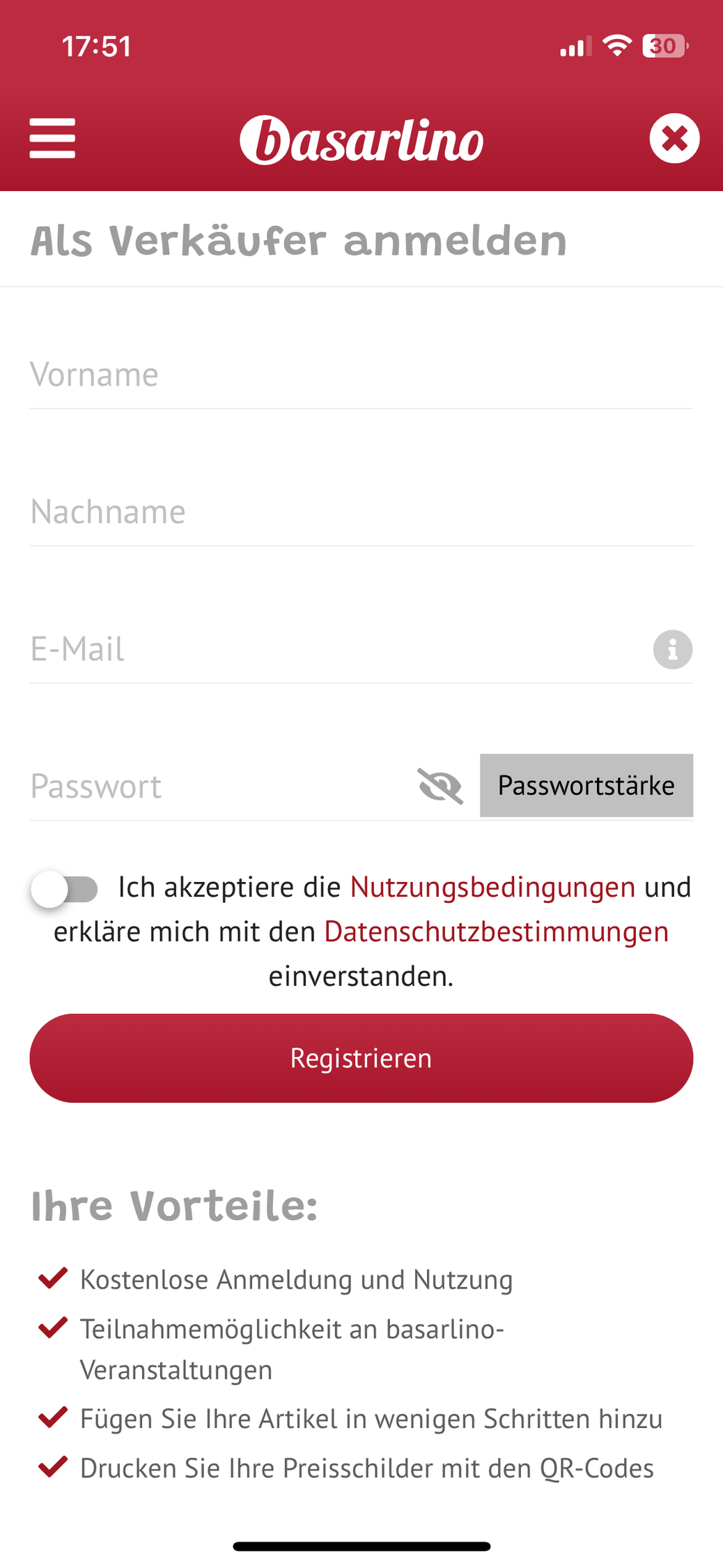 Basarlino arbeitet mit so wenig persönlichen Daten wie nötig. Daher werden neben dem Namen, dem Vornamen und der E-Mail-Adresse keine weiteren Daten benötigt. Natürlich müsst Ihr Euch hier ein Passwort ausdenken und die Nutzungsbedingung sowie die Datenschutzbestimmungen akzeptieren.
